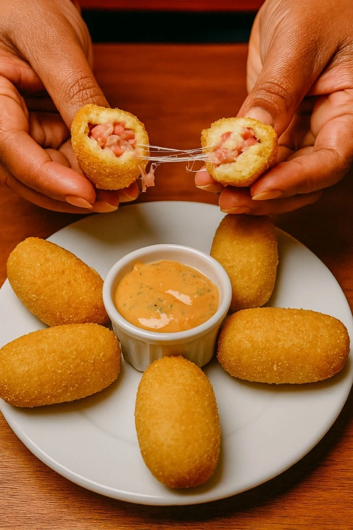 6 unidades de bolinho de carne seca com mandioca e queijo, com acompanhamento de molho especial da casa.